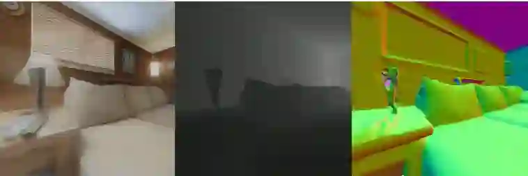 从左到右依次是 RGB 视图、深度视图和表面法线视图。