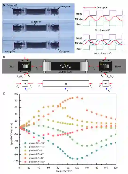同时,团队的研究人员通过考虑软材料的独特特性(如粘弹性和动态共振)来分析机器人的动态特性,并相应地调整驱动电压的频率和相位,以优化机器人的运动速度。