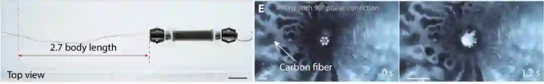 此外,这个基于高频蠕动运动原理的管道机器人由外部的缆线来提供动力,在亚厘米大小的管道中实现了水平和垂直快速运动(速度:1.19身长 / 秒)。