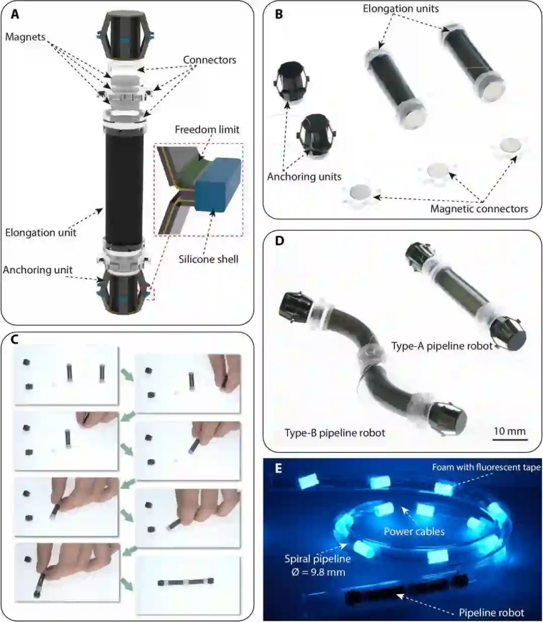 这个机器人采用高功率密度、长寿命的介电弹性体致动器作为人造肌肉,采用基于智能复合微结构的高效锚固单元作为传动装置,使用具有可调节数目的磁单元来快速组装机器人,以适应不同管道的复杂几何形状。