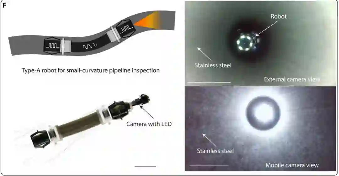 为了验证其管道检测能力,机器人正面安装了一个微型摄像头,从外部控制该机器人,机器人以不同的速度成功完成了一组管道巡检任务演示。