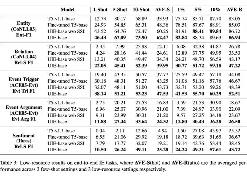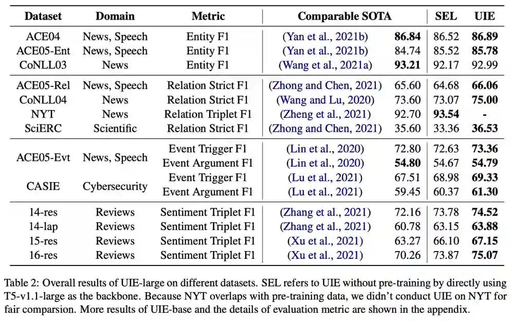 表格右数第二列是未经过UIE预训练的结果(基于T5+SEL直接微调),右数第一列是UIE预训练后微调的结果,可以看出SEL+强大生成模型就可以在信息抽取的统一建模方面取得很强的效果,而经过UIE预训练后则进一步提升了模型表现。