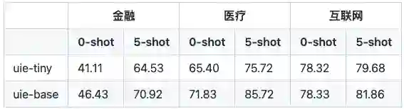 作者在互联网、医疗、金融三个行业关系、事件抽取任务上测试了小样本定制训练效果:
