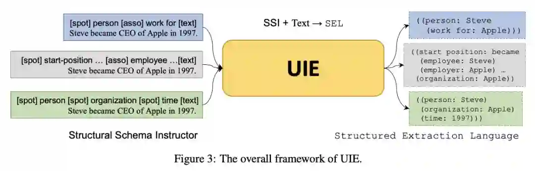 例如上图中,假如我们希望从一段文本中抽取出“人名”的实体和“工作于”的关系,便可以构造[spot] person [asso] work for的前缀,连接要抽取的目标文本[text] ,作为整体输入到UIE中。