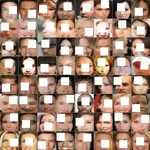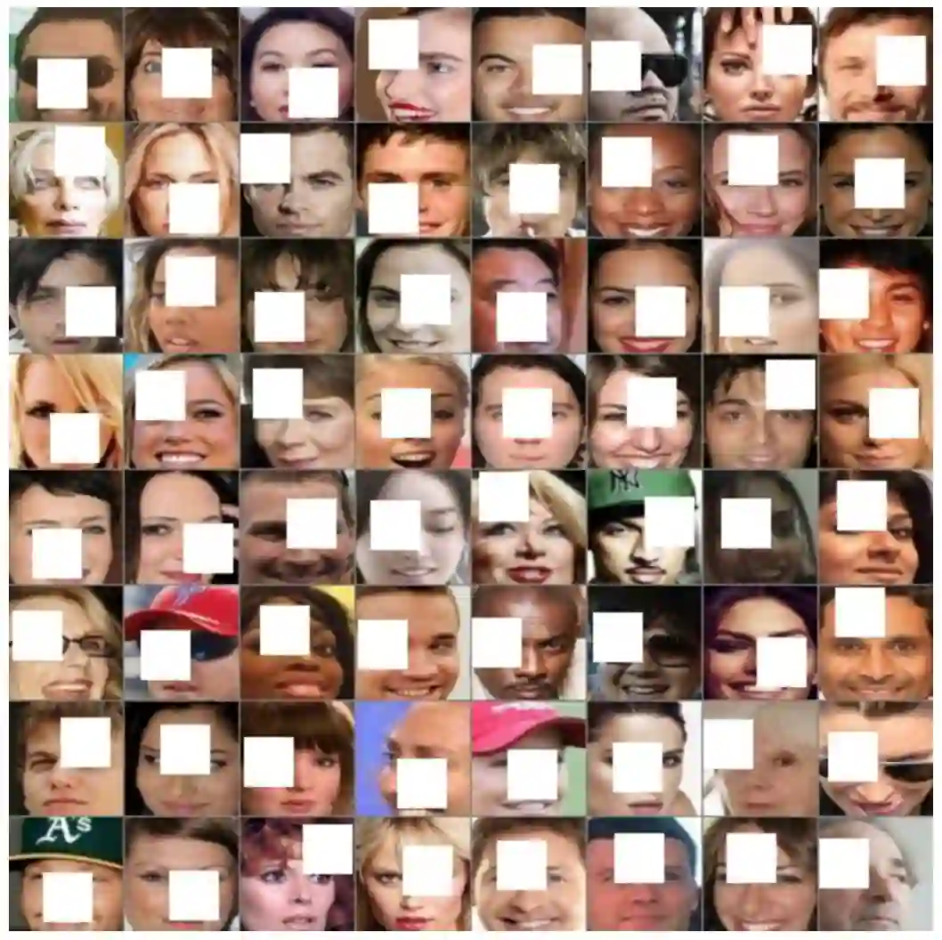 该项目最终使用 CelebA 数据集。为了创建不完整图像的数据集,我们将原版的 CelebA 图像居中剪裁为 32*32 的图像块,并调整尺寸为 64*64,然后将 28*28 的空白图像块(图像块的值填充为 1)随机添加到图像中。