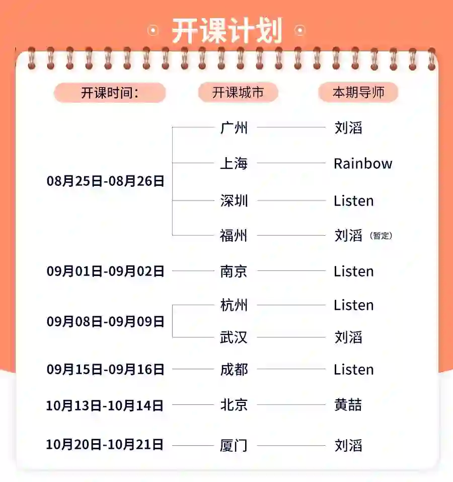 如果你不在深圳也不要紧,我们还有其他几位优秀的导师分别在上海、广州、武汉、北京、厦门等多个城市开课。