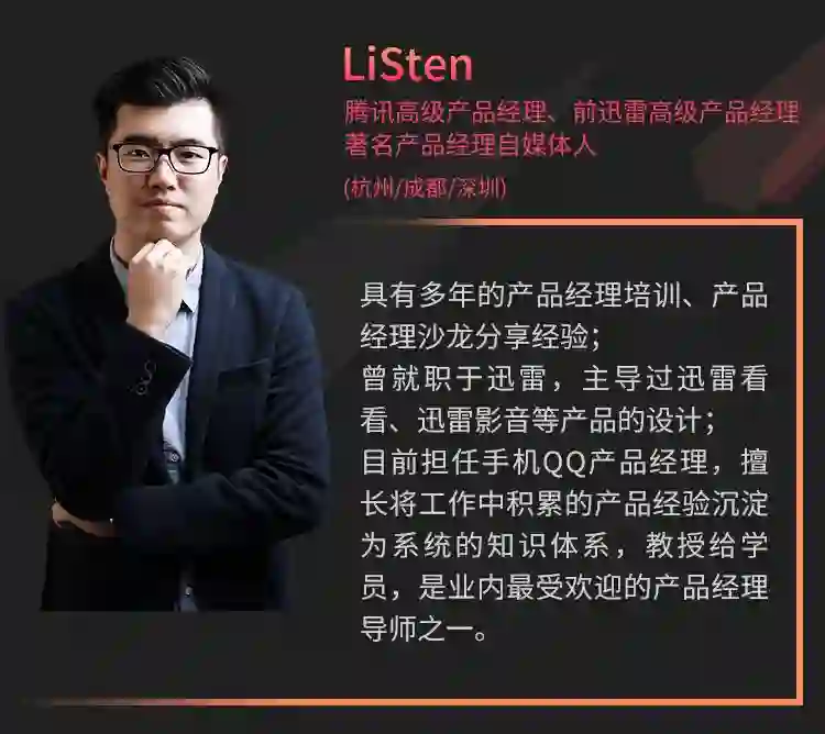 曾主导过迅雷看看、迅雷影音等产品设计,目前担任手机QQ产品经理,腾讯高级产品经理LiSten老师,将为大家解构产品从0到1全过程:0→0.4→0.6→0.7→0.8→0.9→1。