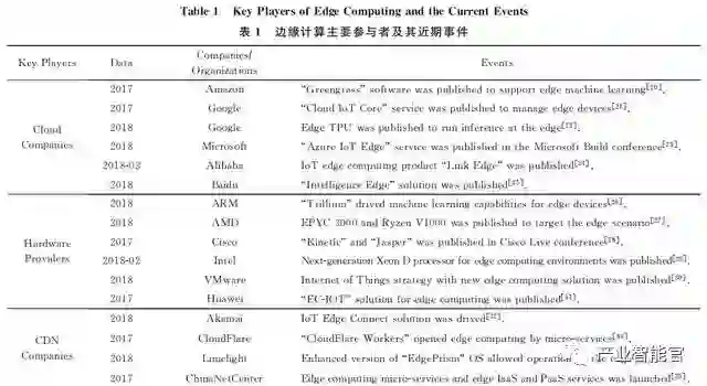 2018年是边缘计算发展过程中的重要节点,尽管此前业内已经对边缘计算报以了很大期望,而 2018年边缘计算被推向前台,开始被大众熟知。这一阶段,边缘计算的参与者范围扩大很快,如表1所示,参与者已经基本涵盖了计算机领域的方方面面,本文将它们分为6类:云计算公司、硬件厂商、CDN 公司、通信运营商、科研机构和产业联盟/开源社区,并在表1中列举它们近2年在边缘计算领域的事件。