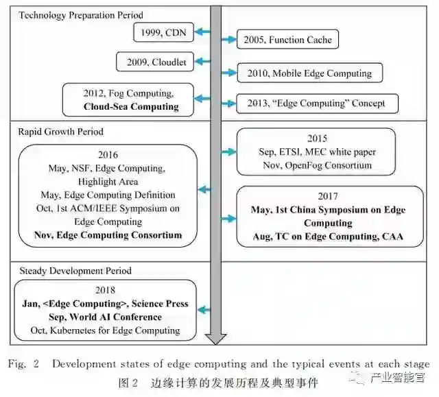 边缘计算在稳健发展期有4个重要事件,2018 年1月全球首部边缘计算专业书籍《边缘计算》出版,它从边缘计算的需求与意义、系统、应用、平台等多个角度对边缘计算进行了阐述.2018年9月17日在上海召开的世界人工智能大会,以“边缘计算,智能未来”为主题举办了边缘智能主题论坛,这是中国从政府层面上对边缘计算的发展进行了支持和探讨.2018年8月两年一度的全国计算机体系 结构学术年会以“由云到端的智能架构”为主题,由此可见,学术界的研究焦点已经由云计算开始逐渐转向边缘计算.同时,边缘计算也得到了技术社区的大力支持,具有代表性的是2018年10月CNCF基金会和Eclipse基金会展开合作,将把在超大规模云计算环境中已被普遍使用的Kubernetes,带人到物联网边缘计算场景中.新成立的Kubernetes物联网边缘工作组将采用运行容器的理念并扩展到边缘,促进Kubernetes在边缘环境中的适用。