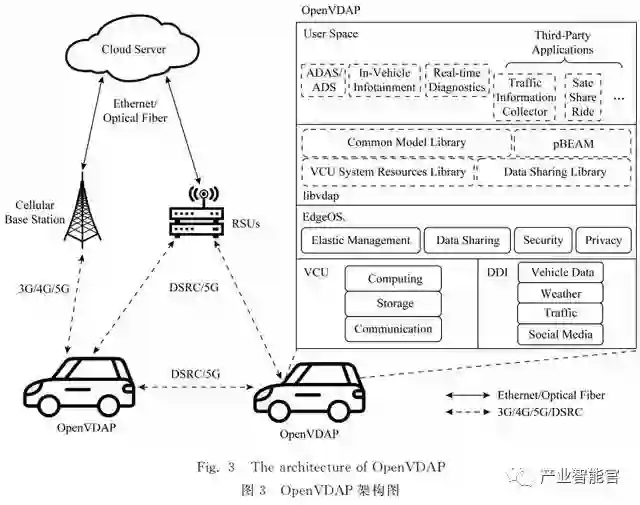 以智能网联车场景为例,车辆逐渐演变成一个移动的计算平台,越来越多的车载应用也被开发出来,车辆的各类数据也比较多。由.Zhang等人提出的OPenVDAP是一个开放的汽车数据分析平台,如下图3所示,Open VDAP分成4部分,分别是异构计算平台(VCU )、操作系统(EdgeOSv)、驾驶数据收集器(DDI)和应用程序库(libvdap),汽车可安装部署该平台,从而完成车载应用的计算,并且实现车与云、车与车、车与路边计算单元的通信,从而保证了车载应用服务质量和用户体验.因此,在边缘计算不同的应用场景下,如何有效地管理数据、提供数据分析服务,保证一定的用户体验是一个重要的研究问题。