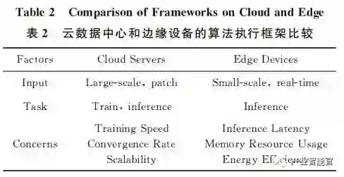 随着人工智能的快速发展,边缘设备需要执行越来越多的智能算法任务,例如家庭语音助手需要 进行自然语言理解、智能驾驶汽车需要对街道目标检测和识别、手持翻译设备需要翻译实时语音信息等.在这些任务中,机器学习尤其是深度学习算法占有很大的比重,使硬件设备更好地执行以深度学习算法为代表的智能任务是研究的焦点,也是实现边缘智能的必要条件.而设计面向边缘计算场景下的高效的算法执行框架是一个重要的方法.目前有许 多针对机器学习算法特性而设计的执行框架,例如谷歌于2016年发布的TensorFloE、依赖开源社区力量发展的Caffe等,但是这些框架更多地运行在云数据中心,它们不能直接应用于边缘设备.如表2所示,云数据中心和边缘设备对算法执行框架的需求有较大的区别。在云数据中心,算法执行框架更多地执行模型训练的任务,它们的输人是大规模的批量数据集,关注的是训练时的迭代速度、收敛率和框架的可扩展性等.而边缘设备更多地执行预测任务,输人的是实时的小规模数据,由于边缘设备计算资源和存储资源的相对受限性,它们更关注算法执行框架预测时的速度、内存占用量和能效。