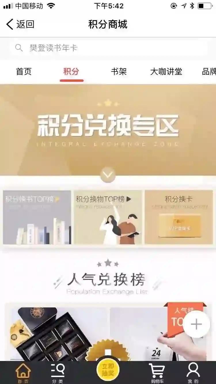 樊登读书会的积分商城包括积分换书/物/卡三大板块,其中读书卡可用3650积分兑换,可享受一年听书会员,这个奖品足够吸引人,也促使用户进行好友分享,增加自己的积分。