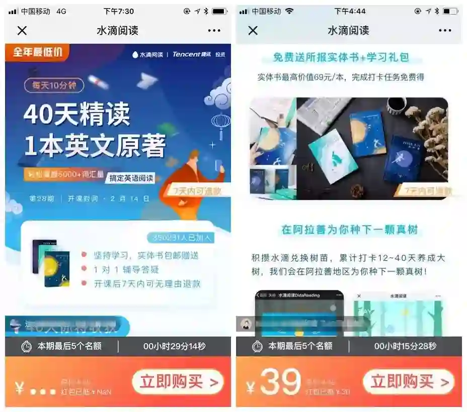 水滴阅读,主打“40天精读1本英文名著”,除了和一般英语读书会相同的“打卡满多少天即送包邮纸质书”外,更有超细分的阶梯奖励,如“坚持7天”送零食大礼包,“坚持14天”送精美水滴手账,“坚持100天”水滴阅读帮你在阿拉善种棵树……如今每天都有上万人报名学习,最近还获得了腾讯的战略投资。
