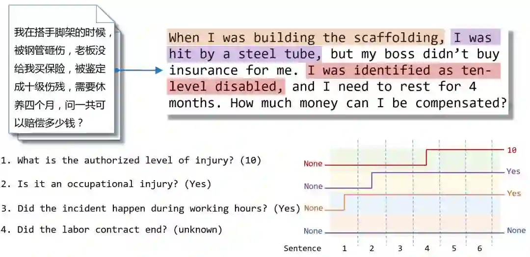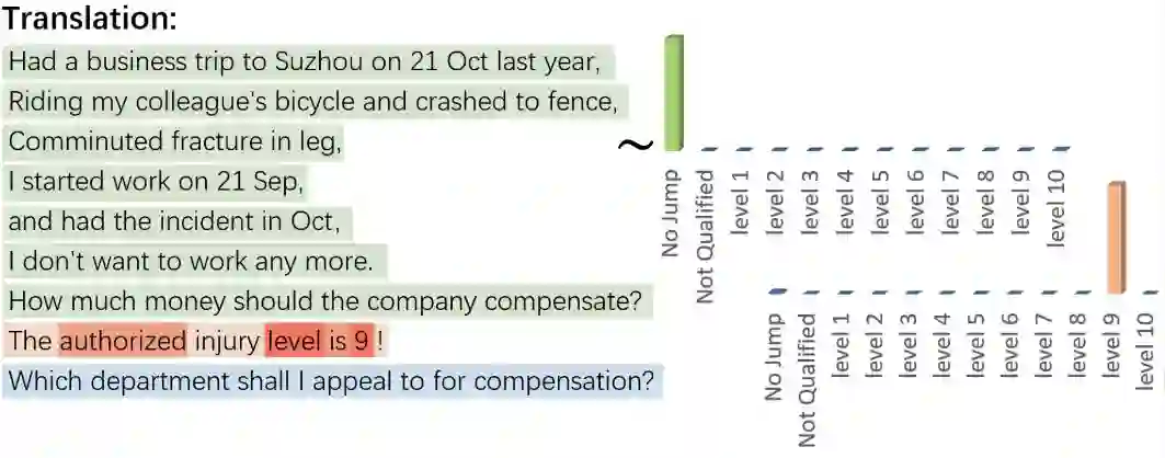 表 3 各模型在工伤等级分类任务(OI-Level)上寻找关键支撑句的效果统计。该任务的关键支撑句在文本中通常聚集于一处,不存在歧义,便于衡量各模型效果。CA:分类准确率,JA:跳跃准确率,OA:在分类准确条件下的跳跃准确率