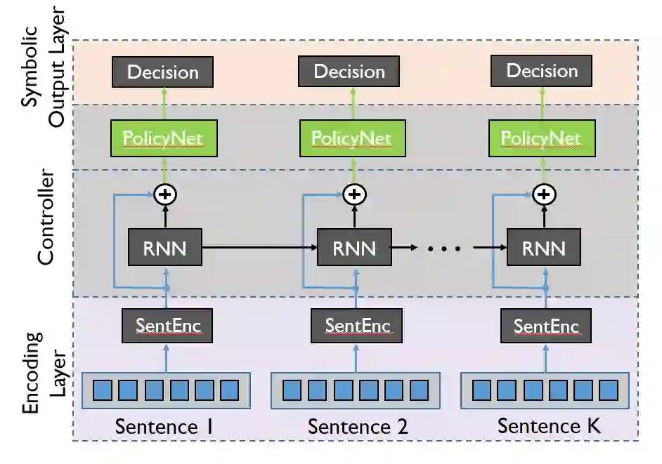 本文提供了一种新的框架,将文本理解建模为一个离散的决策过程。通常在阅读过程中,人们寻找线索、进行推理,并从文本中获取信息;受到人类认知过程的启发,我们通过将句子逐个地递送到神经网络来模仿这个过程。在每个句子中,网络基于输入做出决策(也称为动作),并且在该过程结束时,该决策序列可以视为是对文本有了一些「理解」。