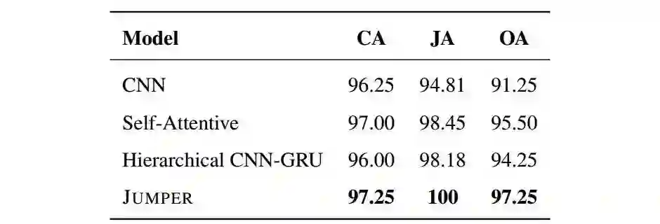 除了准确率高和推断速度快以外,我们更好奇 Jumper 是否能够在信息提取式任务(例如工伤级别分类任务)中找到正确的位置做出决策。我们在 400 个数据点中标注关键支撑句(即最佳跳转位置)作为测试基础。需要注意的是,在这个实验中我们仍然没有跳转位置的训练标签。我们将 Jumper 与使用相同神经网络的层级 CNN-GRU 模型进行比较,但在训练方法方面有所不同;层级 CNN-GRU 在训练时,用段落末尾的交叉熵作为损失函数。在测试期间,我们将预测器应用于每个步骤并找到它做出预测的第一个位置。我们还列出了一个经典 CNN 的结果作为基线模型,并使用了最大池化操作(max-pooling)选择的单词最多的那些句子来作为测试数据。我们使用了跳转动作的准确率来评测 Jumper。通过表 3 可知,Jumper 准确地找到了测试集中所有关键支撑句的位置,说明我们的单跳约束迫使模型更仔细地思考何时做出决策,也验证了强化学习是学习决策正确位置的有效方法。