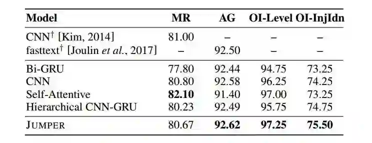 我们对三个任务评估了 Jumper,包括两个基准数据集和一个实际工业应用。我们首先分析了 Jumper 的分类准确性,并与几个基线进行了比较。表 1 显示 Jumper 在所有这些任务上实现了相当或更好的性能,这表明将文本分类建模为顺序决策过程不仅不会损害、甚至提高了分类准确性。
