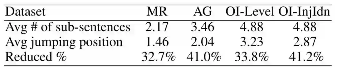 我们想指出,「准确性」并不是我们关注的唯一表现。更重要的是,提出的模型能够减少阅读过程,或者找到文本分类的关键支撑句。只要在阅读过程中基于「跳转约束」限制而看到足够的证据,Jumper 就能做出决定,并且在预测之后不需要再阅读之后的句子。在表 2 中可以看到,我们的模型与强基线相比达到了相似或更高的性能,与此同时,它还将文本读取的长度缩减了 30-40%,从而加速了推断预测。
