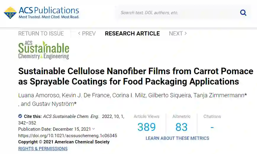 该研究以“Sustainable Cellulose Nanofiber Films from Carrot Pomace as Sprayable Coatings for Food Packaging Applications”为题,发表在最新一期的 ACS Sustainable Chemistry & Engineering 杂志上。