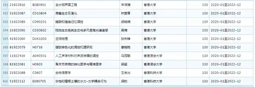 澳门大学(4项)、香港大学(7项)、香港城市大学(3项)、香港浸会大学(2项)、香港科技大学(3项)、香港理工大学(2项)、香港中文大学(4项)。