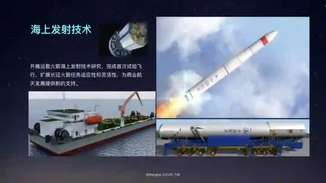 其次,研发海上发射技术。我们开展了运载火箭的海上发射技术研究,完成首次试验飞行,为商业航天发展提供新的支持。我们可以将一些小火箭和商业火箭的发射转移到海上,在公海上怎样打都砸不到人,只能砸着鱼。