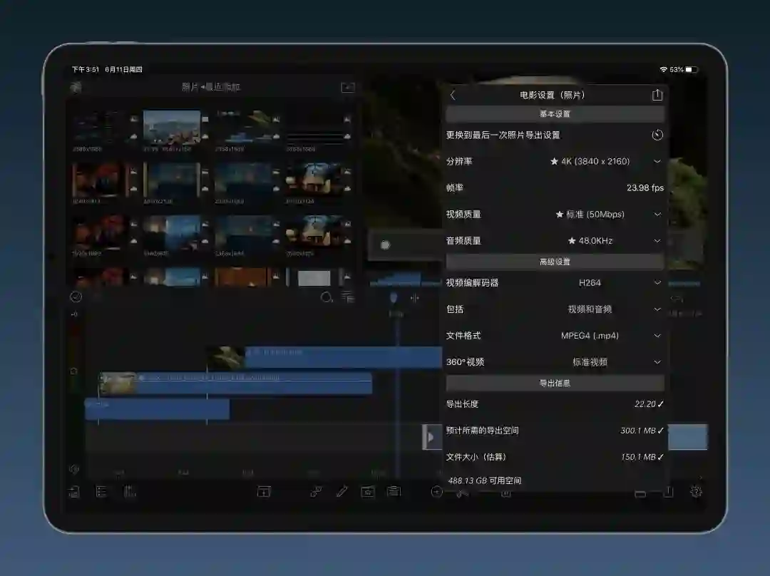 到了输出环节,iPad Pro也没让小Z失望,利用最佳设定(4K分辨率、23.98FPS、H.264)输出一段20多秒的4K视频,几乎是同步输出每秒的4K视频,完全打破了之前小Z对剪辑视频的看法。
