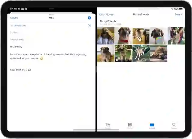 如果想在iPad文本中插入一张图片,你无需再用手机上那种保存图片再上传图片的繁琐操作,轻轻滑出Dock栏,按住照片应用创建分栏,再拖动图片到文本当中,当当当,图文内容就轻松做出来啦。