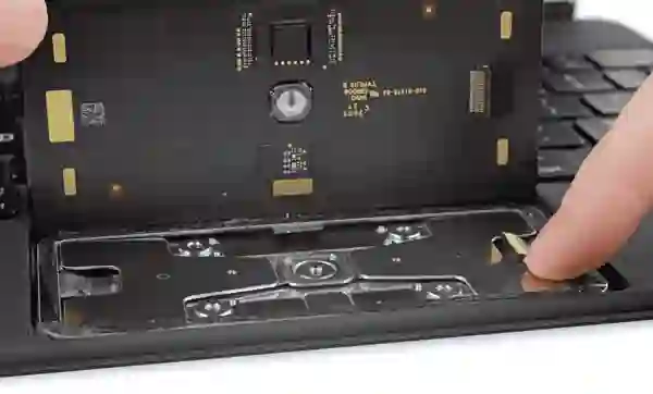 在iFixit的拆解报告中,这块触控板的结构非常像大号的蝶式结构:主轴同时是按钮,在中间施加压力时会直接按下按钮,而在边角按压时,就会触发杠杆系统,中间的接触板往上顶并发出咔哒的声音,在整块触控板中,得到的物理反馈几乎是完全一致的。