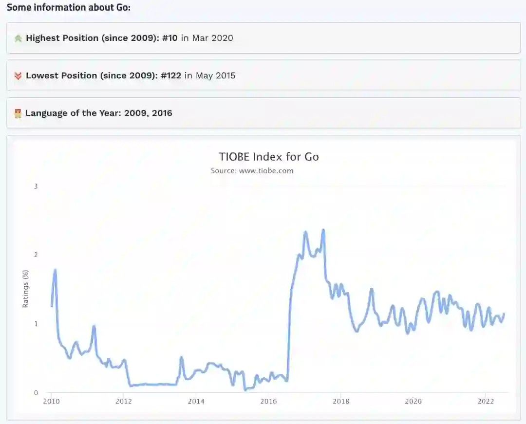 从 TIOBE Index 对 Go 语言的使用情况统计来看,Go 语言近几年的发展是比较稳定的。