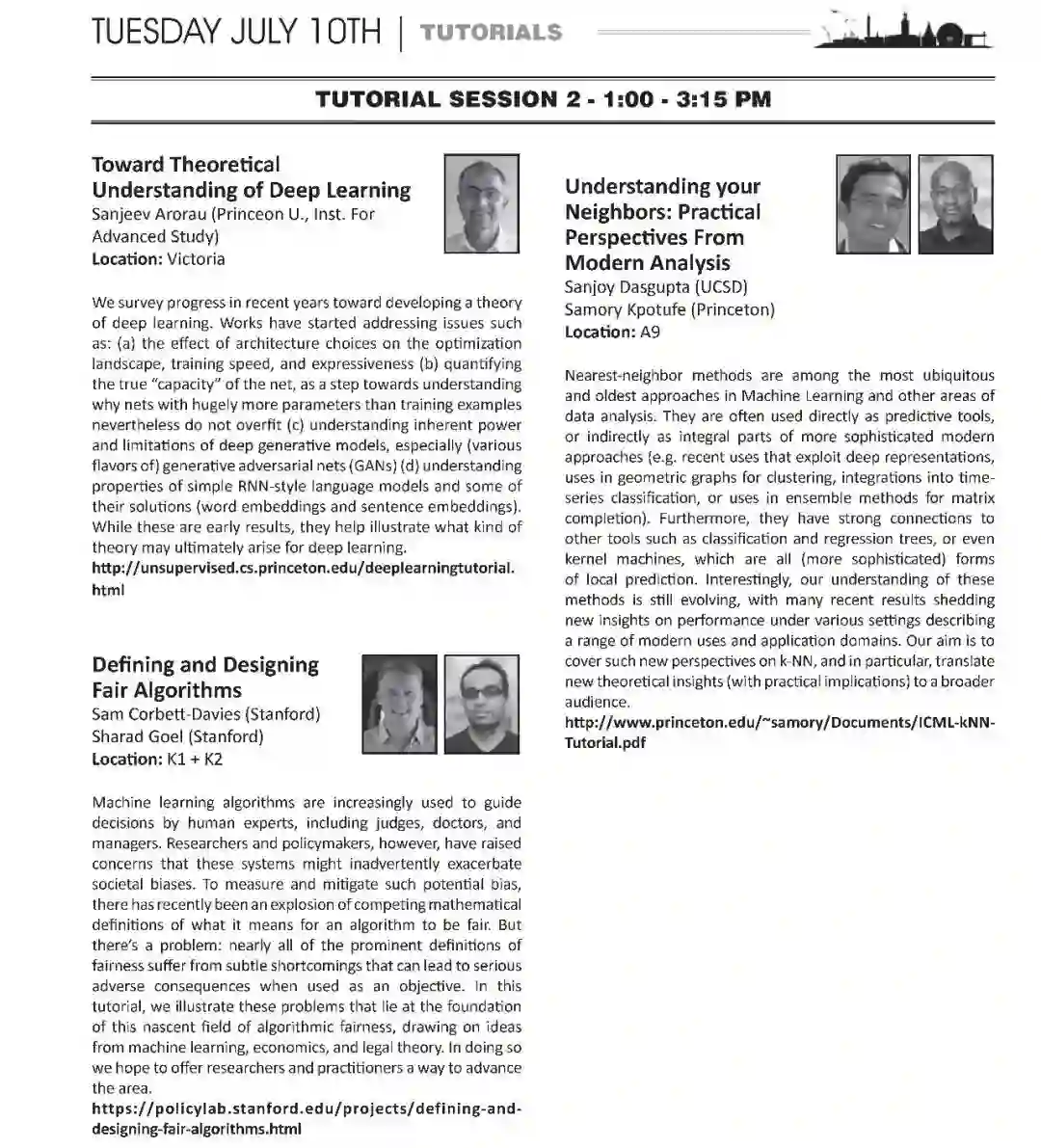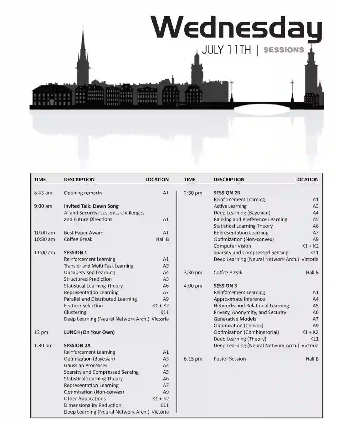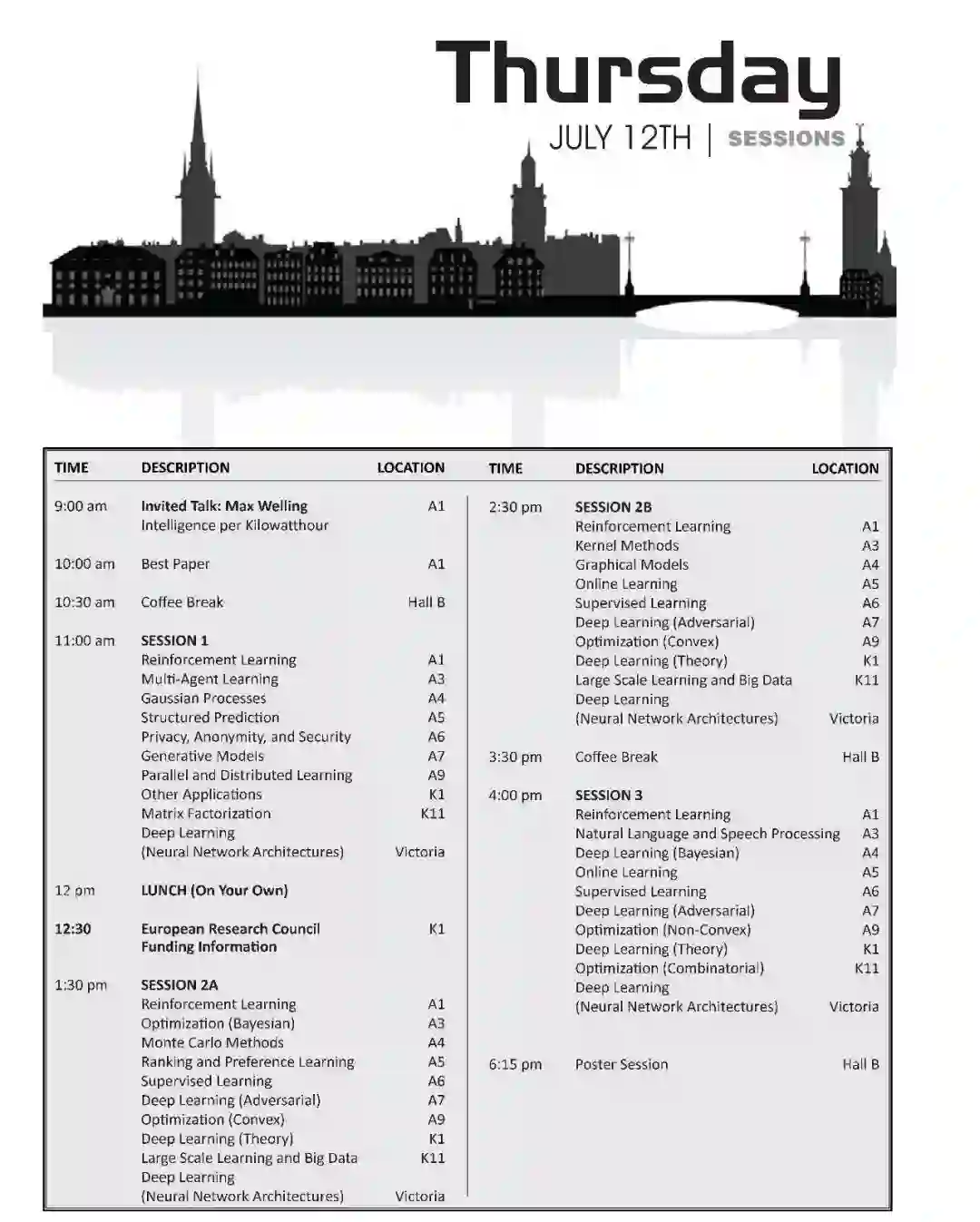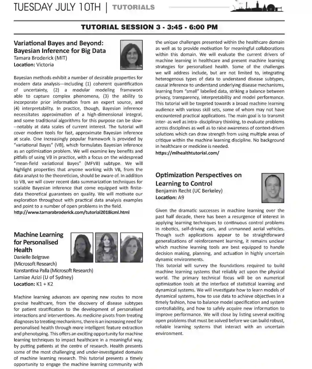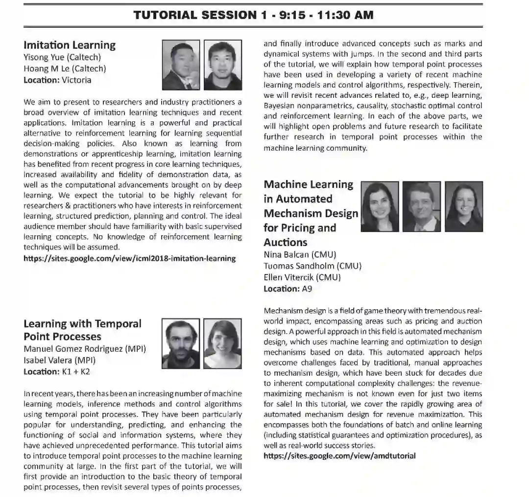 ICML2018会议日程从10号开始,以Tutorial展开!涵盖有限学习、变分贝叶斯、优化方法、自动机器学习等。