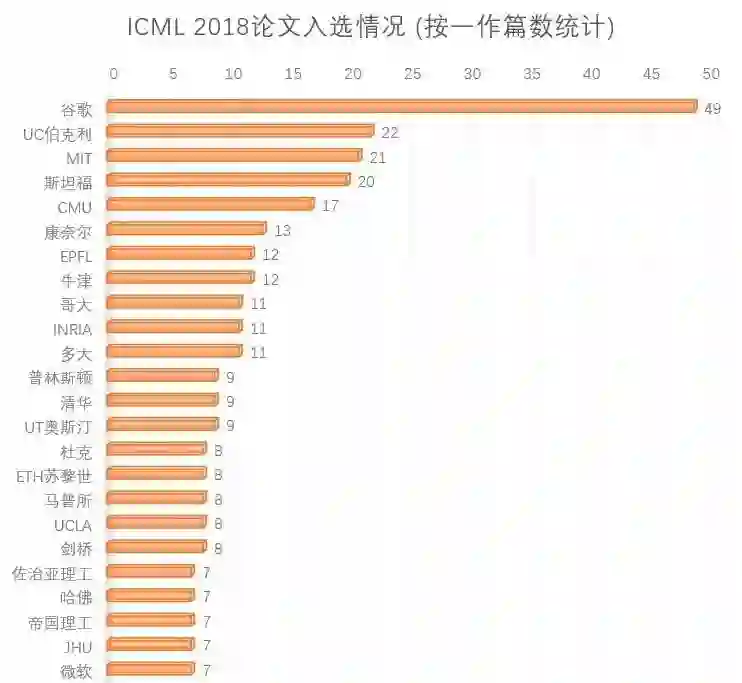 ICML 2018共有2473篇论文投稿,共有621篇论文接受,接受率接近25%。论文作者机构以谷歌最多达49篇,国内清华有9篇,在基础性人工智能算法研究,国内需要不断努力!