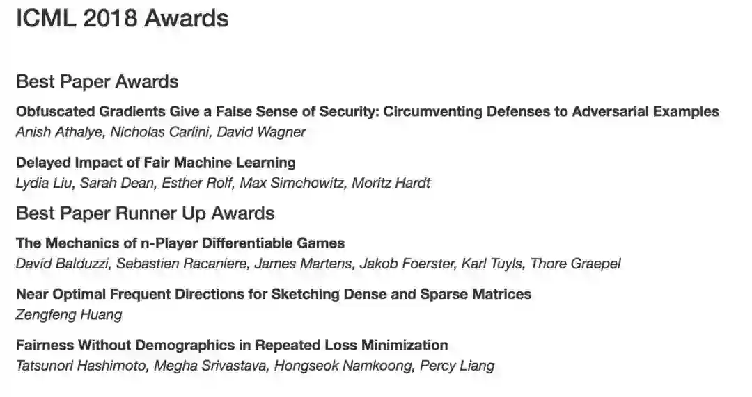 ICML 2018提前公布了最佳论文获奖名单,在超过 600 篇被接收论文中,来自 MIT 和 UC Berkeley 的研究人员分享了最佳论文的殊荣。ICML 2018大奖出炉:伯克利、MIT获最佳论文,复旦大学榜上有名