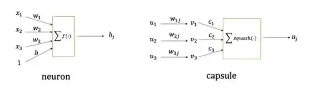 图2对neuron和capsule进行对比。神经网络的输入是一系列的标量,通过对这些标量进行加权求和并经过激活函数,得到一个标量,也就是神经元的最终输出。capsule的输入则是一系列的向量,这些向量首先经过一个编码整体与部分关系的矩阵映射,然后这些向量根据和整体特征的相似度加权平均,得到表示整体的特征向量,最后通过一个squash函数得到capsule的输出。高层特征由低层特征加权得到,而权重又由高层特征和低层特征的相似程度计算得到,这两个问题相互依赖,于是capsule network提出一种动态路由算法(Dynamic Rounting)。