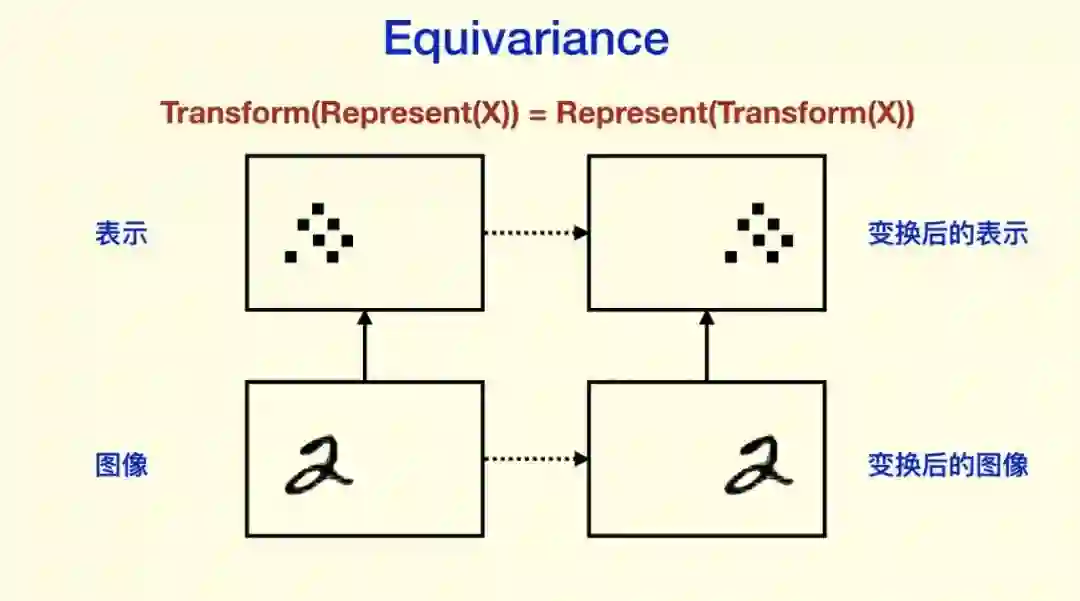 Hinton认为人的视觉系统会建立“坐标框架”,并且坐标框架的不同会极大地改变人的认知。而在CNN上却很难看到类似“坐标框架”的东西。Hinton的看法是,我们需要 Equivariance 而不是 Invariance。Invariance,是指表示不随变换变化,比如分类结果等等;而 equivariance 不会丢失这些信息,它只是对内容的一种变换。