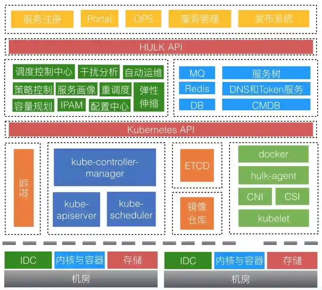 之后,在生产环境中经过不断摸索和尝试,我们逐渐意识到,仅仅满足于集群的弹性伸缩能力是不够的,成本和效率肯定是未来必将面临且更为棘手的问题。我们吸取了2年来HULK 1.0的开发和运维经验,在架构和支撑系统层面做了进一步优化和改进,并借助于生态和开源的力量来为HULK赋能,即引入了开源的集群管理与调度系统Kubernetes,期望能进一步提升集群管理、运行的效率和稳定性,同时降低资源成本。所以我们从自研平台转向了开源的Kubernetes系统,并基于Kubernetes系统打造了更加智能化的集群管理与调度系统——HULK2.0。