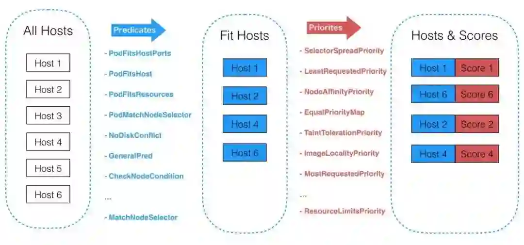 预选阶段:硬性条件,过滤掉不满足条件的节点,这个过程称为 Predicates。这是固定先后顺序的一系列过滤条件,任何一个 Predicate不符合则放弃该 Node。