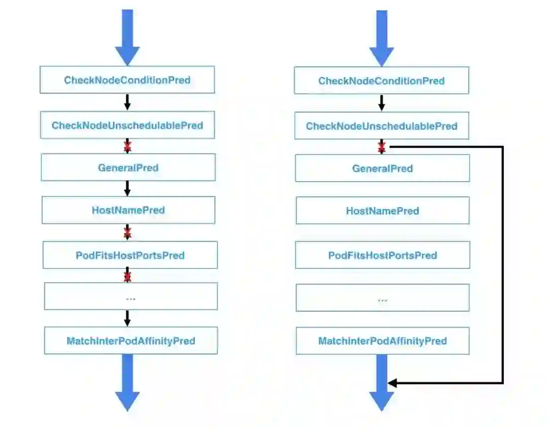 通过深入分析调度过程可以发现,调度器在预选阶段即使已经知道当前 Node不符合某个过滤条件仍然会继续判断后续的过滤条件是否符合。试想如果有上万台 Node节点,这些判断逻辑会浪费很多计算时间,这也是调度器性能低下的一个重要因素。