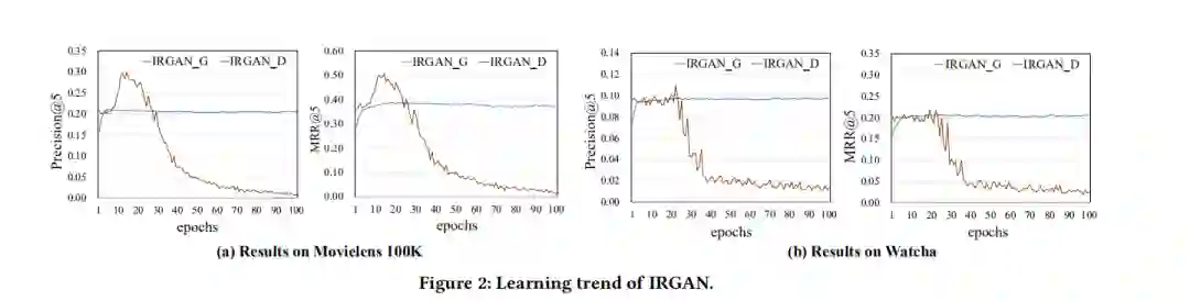 IRGAN的问题在于训练过程中,生成器会慢慢学到真实的概率分布(下图 a-b的过程),从而生成和真实情况相同的项目ID,但是这会让判别器“感到困惑”,比如下图中的i3,既出现在“real”中,被标记为真实数据,又出现在“fake”中,被标记为生成的数据。这种相互冲突的判别会使得判别器的迭代出现问题 ,从而导致判别器的性能下降。CFGAN一文中用实验展示了该问题: