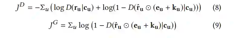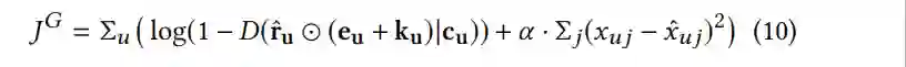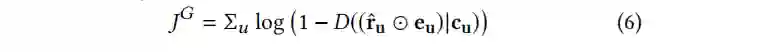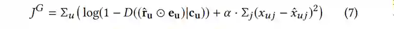给出生成器G的目标函数:接着来看判别器网络的设计:判别器的输入是经过了和真实评分过的项目向量(只有0/1)进行masking的操作之后的生成向量或者用户真实的评分向量u,用户的描述信息向量c。输出的结果是一个概率值代表输入的是真实的评分向量的概率。