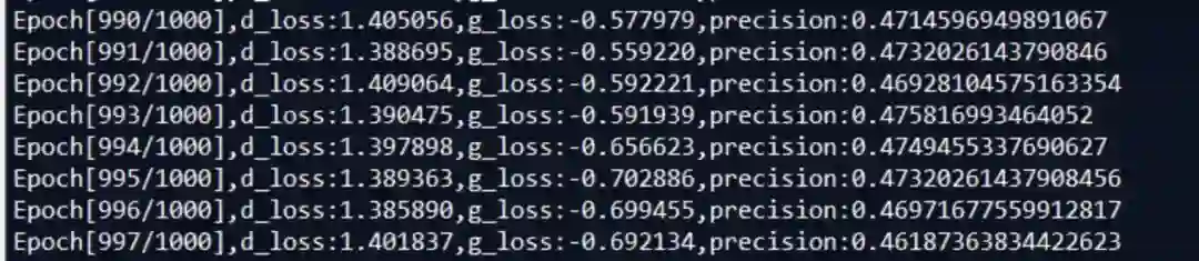 从实验结果可以看出,判别器的性能在经过初期的上升后就会持续下降到一个很差的结果上,判别器的性能太差会导致生成器缺少“督促”,因此生成器的性能也得不到提升。