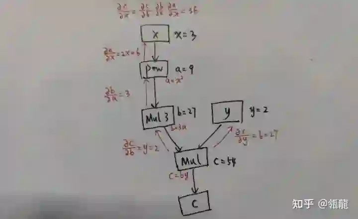 这很清晰地展示了计算图的功能,它记录了每一个变量(包括输出、中间变量)的计算函数(可以称之为一个算子,就是图中的方框,入边是输入,出边是输出),从而可以数值计算出相应的导数。实际上,任何变量qqq对ppp求导都可以对两者之间的反向链路进行累乘得到。