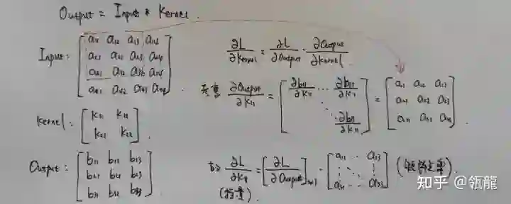 那么问题就是求Output对Kernel的偏导,我们用一个简单的例子来推导: