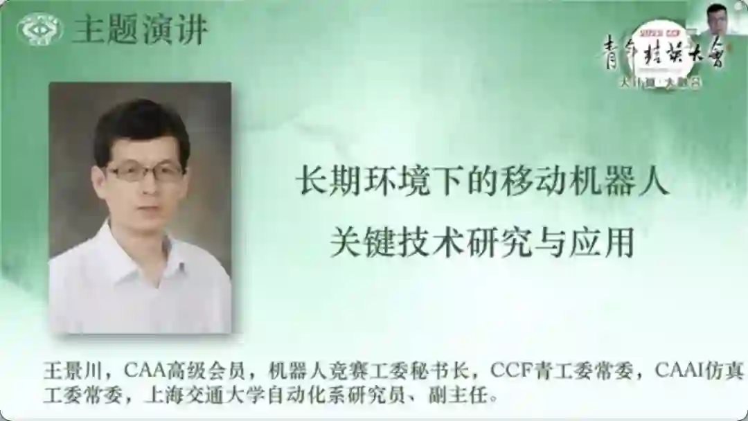 第四位嘉宾是来自上海交通大学的王景川研究员,演讲题目是“长期环境下的移动机器人关键技术研究与应用”。他针对当前实际应用场景中对移动机器人长期连续自主作业的能力要求越来越高的现状,主要讨论了环境动态变化和拥挤等复杂因素对移动机器人实际应用所带来的巨大技术挑战。