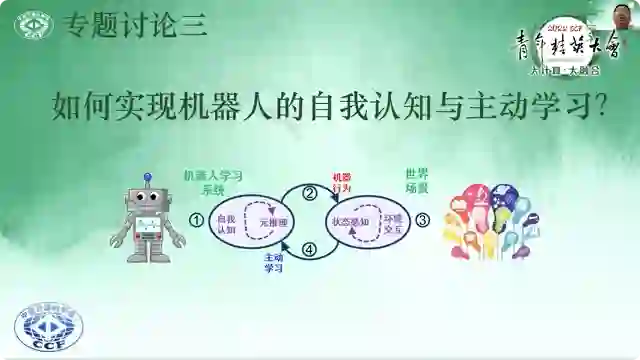 第三个讨论话题是“如何实现机器人的自我认知与主动学习?”。机器人的自我认知代表着机器能否有效地区分本体、其他智能体和外界环境,也是实现机器意识的先决条件。同时,对于机器人来说各种场景的信息量巨大,如何有选择性地进行学习,找出其中的有用知识并不断增强机器人的自身能力是非常重要的问题。那么如何才能够实现机器人的自我认知,进而主动地有选择性地进行学习呢?