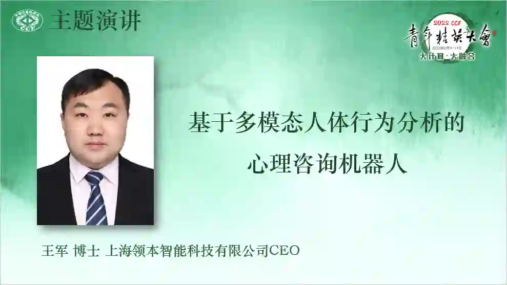 第五位嘉宾是上海领本智能的CEO王军博士,演讲题目是“基于多模态人体行为分析的心理咨询机器人”。他主要介绍了领本智能所开发的心理咨询机器人在实际场景中的应用。