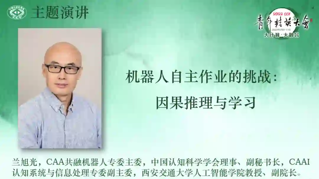 其中,来自西安交通大学的兰旭光教授的报告题目是“机器人自主作业的挑战:因果推理与学习”。报告简要介绍了机器人在智能方面的研究进展和面临的挑战,特别关注了人机协作中机器人在非结构化场景的自主理解、学习和作业等方面的难点。