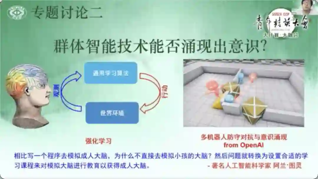 第二个讨论话题为“群体智能技术能否涌现出意识?”。著名人工智能科学家阿兰图灵曾经说过,与其去模拟更为复杂的成人大脑,不如直接构造具有初级学习能力的智能体,然后不断教育该智能体使其逐渐获得人类智能。强化学习算法曾经助力AlphaGO和AlphaZero打败人类顶尖棋手,而著名的人工智能研究机构OpenAI则在2018年使用了一个捉迷藏游戏来模拟多智能体博弈,在这个过程中发现智能体在竞争、对抗和合作的场景中会产生极为复杂的智能行为。这是否意味着智能体通过对抗博弈可以涌现出自我意识呢?