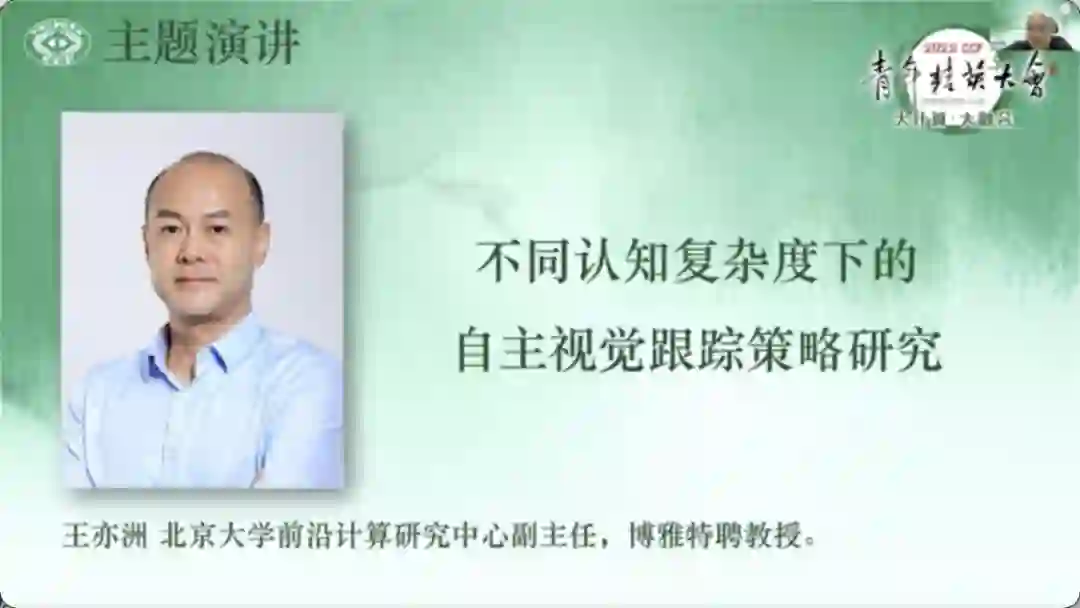 第二位嘉宾是来自北京大学的王亦洲教授,报告题目是“不同认知复杂度下的自主视觉跟踪策略研究”。他首先介绍了在高逼真度的虚拟环境中,智能体通过探索和互动来学习完成任务所需技能的过程。之后,王亦洲教授介绍了北京大学最近在相关方面的一系列研究成果,并主要阐述了智能体如何在虚拟环境中采用不同复杂度的认知机制以“自主”地进行训练,从而完成富有挑战性的目标跟踪任务。