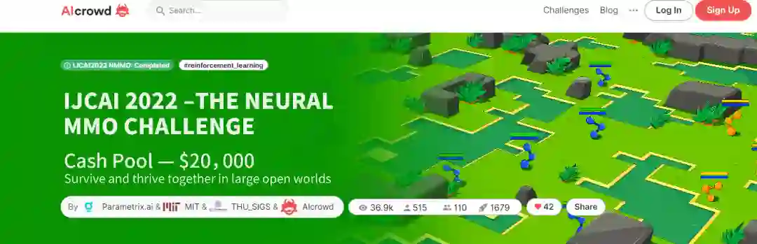 「IJCAI 2022-Neural MMO 海量 AI 团队生存挑战赛」使用的正是上述环境。主办方表示,选择 Neural MMO 主要基于两点:一是 Neural MMO 类似于开放世界生存游戏,本身有一个自运转系统,并且定义了采集、攻击、生存等基本机制,二是它支持海量 AI 共存、交互,并涌现策略。无论在学术界还是工业界,这种环境都不多见。