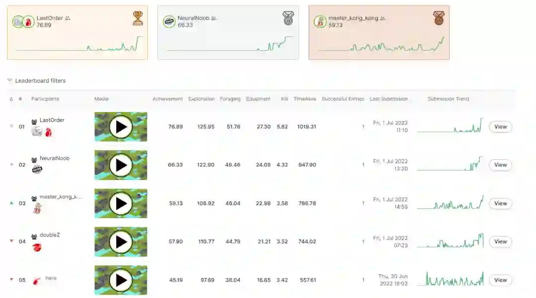 在工具层面,「IJCAI 2022-Neural MMO 海量 AI 团队生存挑战赛」升级了提交系统,让第一次成功提交到返回结果的时间从原来的两个多小时减少到十分钟;此外,挑战赛还提供了全新的 StarterKit 和 Baseline 。在 StarterKit 中,参赛者只需要跑一遍代码,就可以完成第一个提交;在 Baseline 中,用户只需要训练两天,就可以完成 Stage 1 0.5 的胜率,运行训练四天,就可以获得 Stage 1 0.8 的胜率。